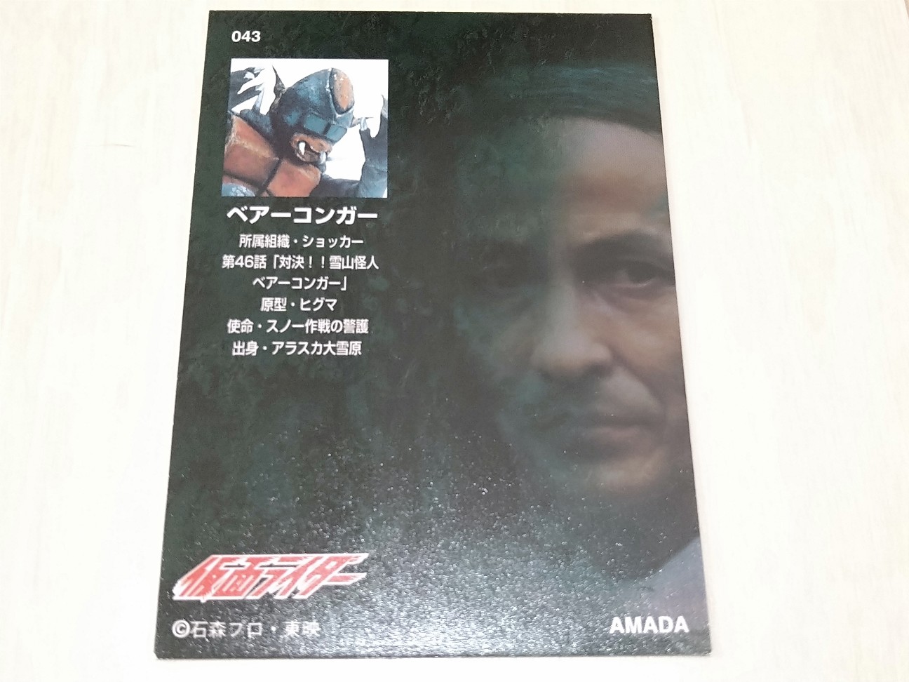 2025-12-05 仮面ライダー トレーディングコレクション 1号・2号編 043 ベアーコンガー グッズ紹介 「仮面ライダー トレーディングコレクション 1号・2号編 043 ベアーコンガー」 発売日 1998年 価格 メーカー 天田印刷加工 「仮面ライダー」の第46話に登場したベアーコンガーのカードです。ベアーコンガーといえばというくらいに有名な写真です。