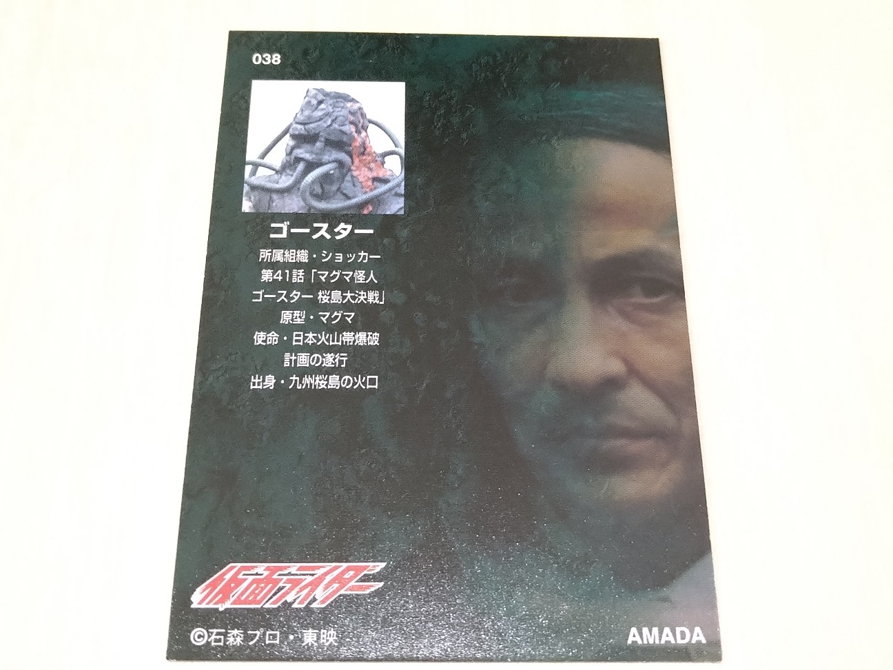 2025-12-05 仮面ライダー トレーディングコレクション 1号・2号編 038 ゴースター グッズ紹介 「仮面ライダー トレーディングコレクション 1号・2号編 038 ゴースター」 発売日 1998年 価格 メーカー 天田印刷加工 「仮面ライダー」の第41話に登場したゴースターのカードです。溶岩をモチーフとした怪人です。