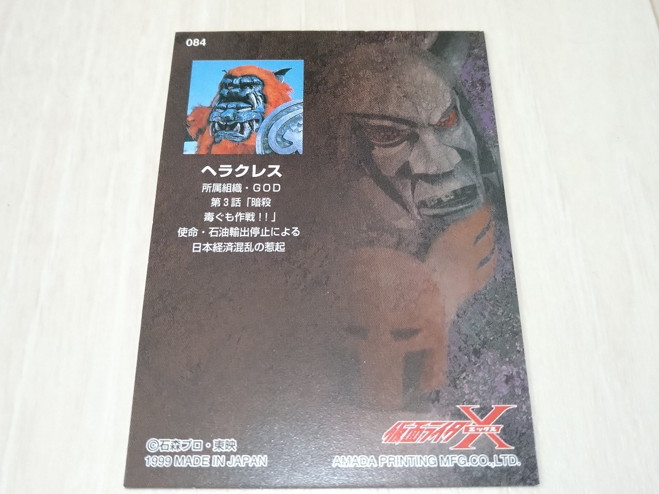 2026-01-31 仮面ライダー トレーディングコレクション V3・X編 084 ヘラクレス グッズ紹介 「仮面ライダー トレーディングコレクション V3・X編 084 ヘラクレス」 発売日 1999年 価格 メーカー 天田印刷加工 「仮面ライダーX」の第3話に登場したヘラクレスのカードです。日本への石油輸出を停止させて日本経済に打撃を与えようと、アダブ王国のキバラ特使を狙いました。